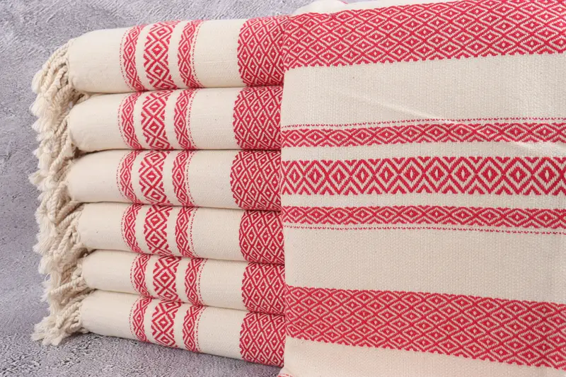 トルコタオルは高級トルコ綿から作られており、優れた吸収性と柔らかさを保証します。寸法が 36 x 71 インチ (90 x 180 cm) で公差が 2.5 cm までであることが特徴で、タオルの重さは 400 グラムで、丈夫でありながら軽量なテキスタイルです。これらのタオルは防縮加工が施されているため、最初の洗濯後すぐに使用できます。