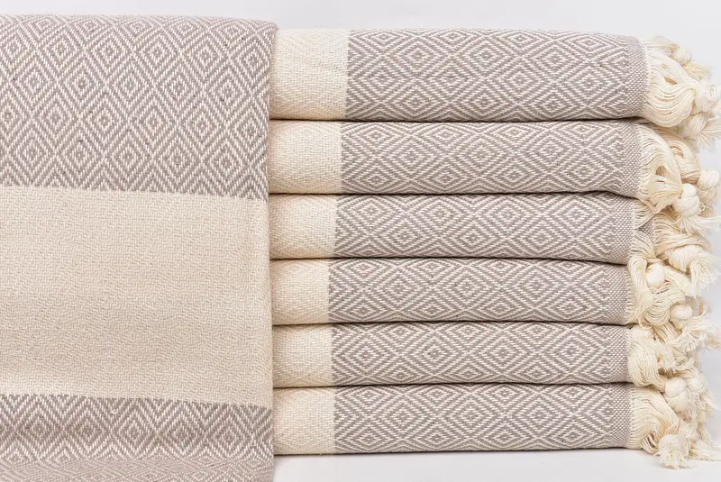 トルコタオルは、高級トルコ綿を使用しており、優れた吸水性と速乾性を備えています。伝統的な手織り機で作られたタオルは、重さ約 420 グラム、寸法は 40x71 インチ (100x180 cm) で、公差は 1 ~ 2.5 cm です。これらのタオルはモノグラム入りでカスタマイズが可能で、防縮加工済みの状態なので洗濯後の縮みがないことが保証されます。