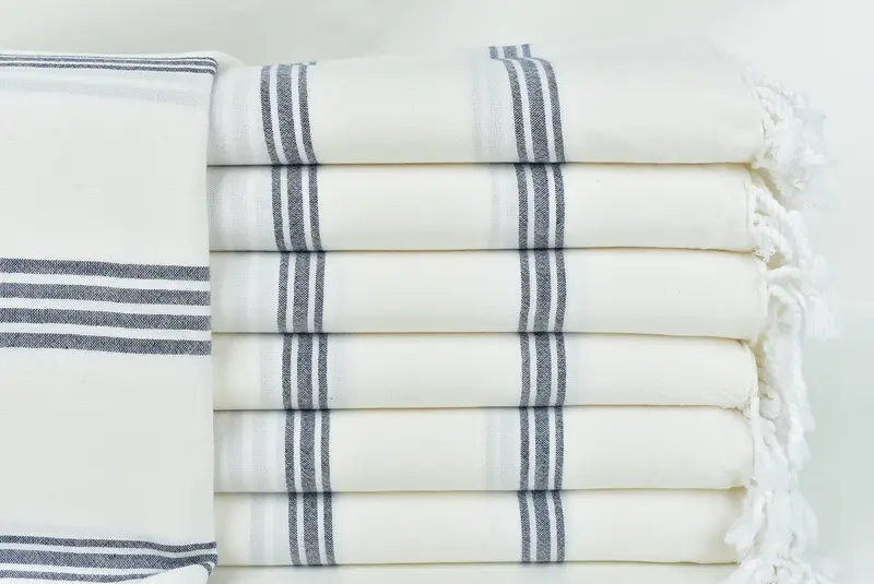 トルコタオルの繊維組成は、高品質のトルコ綿を特徴としており、迅速な吸収と乾燥を保証します。これらのタオルの重さは約 240 グラム、サイズは 40x71 インチ (100x180 cm) で、1 ~ 2.5 cm のわずかな寸法の違いは許容されます。伝統的な手織機による製織により、これらの仕様を高い精度で遵守しています。