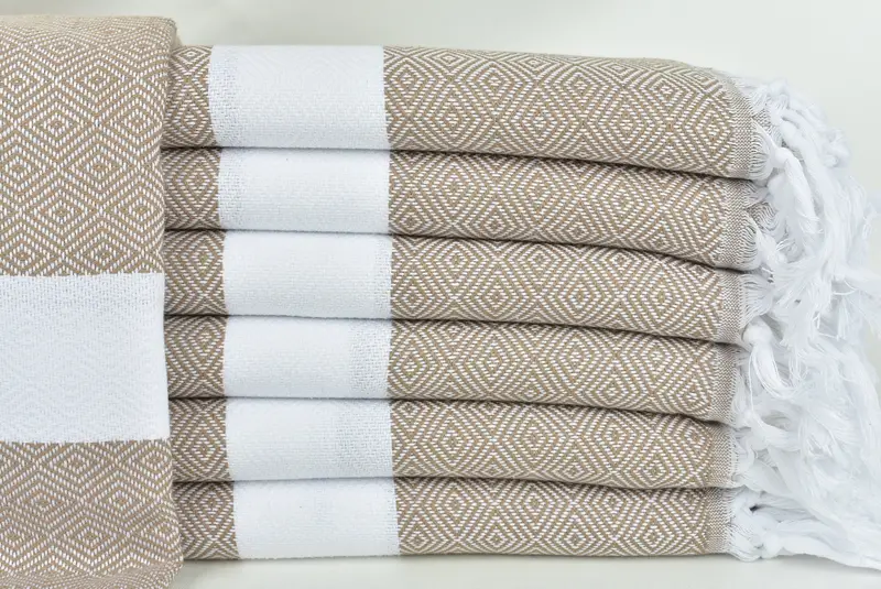 トルコタオルは高級トルコ綿から作られており、優れた吸収性と柔らかな肌触りを保証します。これらのタオルのサイズは 40x71 インチ (100x180 cm)、許容誤差は ±2.5 cm、重さは約 360 グラムです。手織りのため、寸法に若干の誤差が生じます。