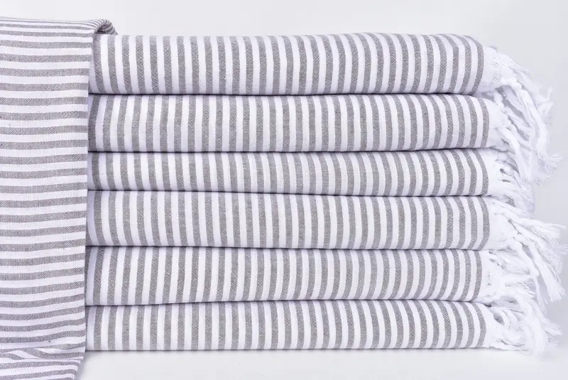 トルコタオルは高級トルコ綿から作られており、標準的なタオルとは異なり、優れた吸収性と速乾性を保証します。これらのタオルの寸法は 40x63 インチ (100x160 cm) で、許容誤差は 1 ~ 2.5 cm で、重さは約 200 グラムです。タオルは一枚一枚、伝統的な織機で丁寧に手織りされています。