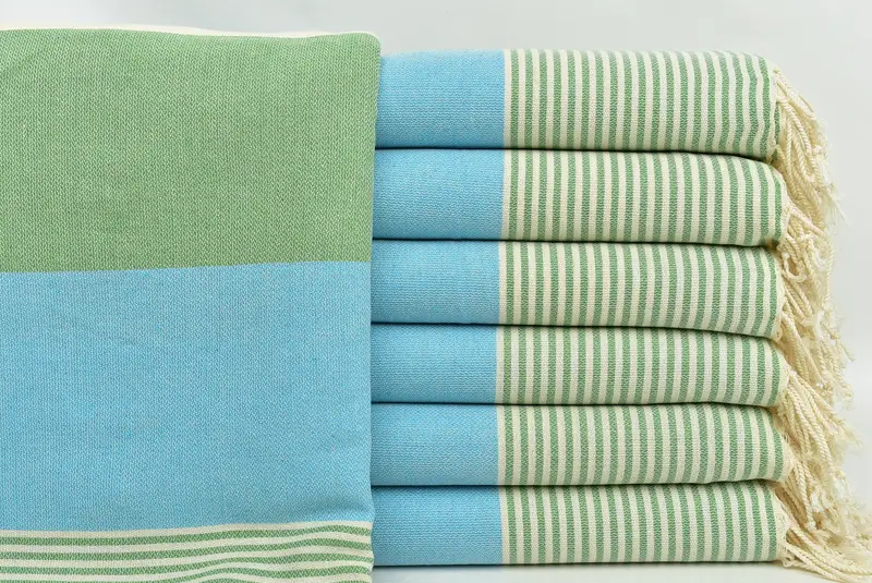 トルコタオルはプレミアムトルココットンを使用しているのが特徴で、優れた吸収性と素早い乾燥時間を保証します。 ±1 ~ 2.5 cm の誤差で手織りされたタオルのサイズは 40 x 69 インチ (100 x 174 cm)、重さは約 298 グラムです。各ピースは個別に防縮加工されており、寸法の完全性を維持します。