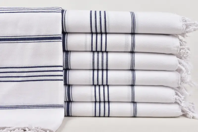高級トルコ綿は高い吸水性と速乾性を実現し、さまざまな用途に最適なタオルです。伝統的な手織り機が特徴のこれらのタオルのサイズは 40x71 インチ (100x180 cm)、余白は 1 ~ 2.5 cm です。重量は約 300 グラムで、柔らかさを保ちながら耐久性を考慮して設計されています。
