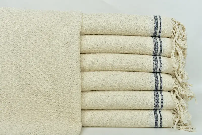 トルコタオルはトルコ綿由来の優れた吸水性と速乾性が特徴です。軽量で吸水性が高く、すぐに乾くタオルは、さまざまな用途に最適です。トルコタオルのサイズは 36x67 インチまたは 90x170 cm、公差は最大 5 cm、重さは約 440 グラムです。