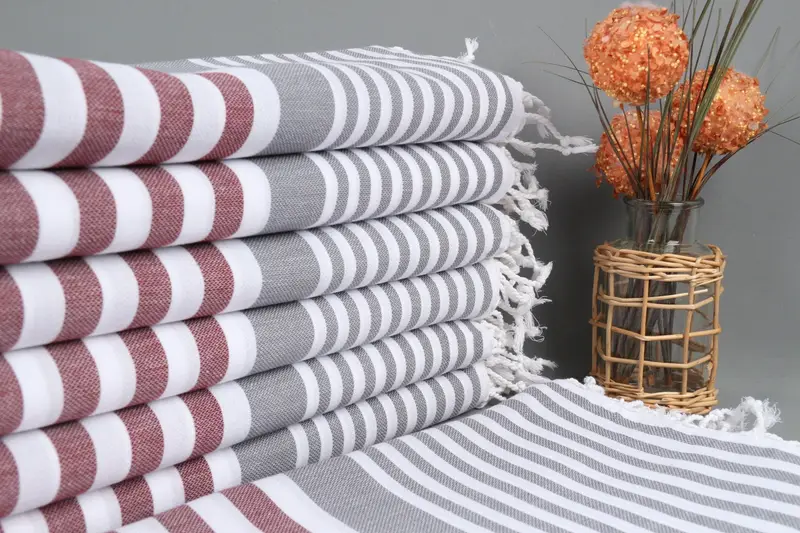 パーソナライズされたビーチタオル オーガニックコットン バーガンディグレーストライプ、36x67インチ