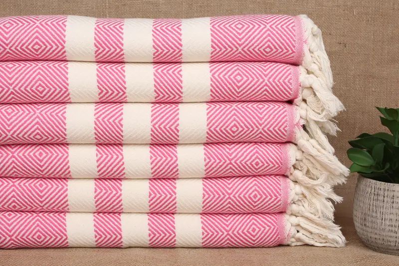 トルコタオルは、吸水性と速乾性に優れたピュアオーガニックコットンが特徴です。タオルのサイズは 20x32 インチ (50x80 cm) で、手織りプロセスのため許容誤差は ± 2 インチ (5 cm) です。重さは約 100 グラムで、これらのタオルはモノグラムの刺繍でカスタマイズできます。