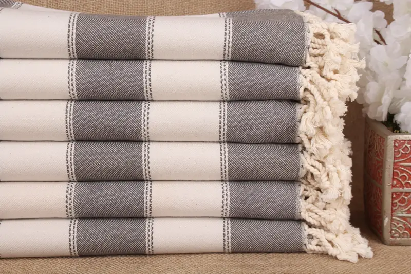 両面編み構造が特徴のトルコ綿タオルは、トルコ綿糸100%で作られており、高い吸水性と速乾性を実現しています。タオルのサイズは36x65インチ(90x165cm)、重さは約300グラムです。手織りの公差により、サイズに±2インチまたは5センチメートルの誤差が生じる場合があります。