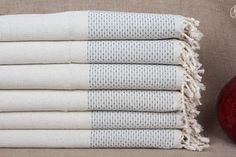 100% トルコ綿糸で構成されたタオルは優れた吸収性を保証し、迅速な乾燥時間を実現します。タオルの指定寸法は 20x40 インチまたは 50x100 センチメートルですが、手織りの慣行により±2 インチまたは 5 センチメートルのわずかな誤差があります。各タオルの重さは約 120 グラムです。