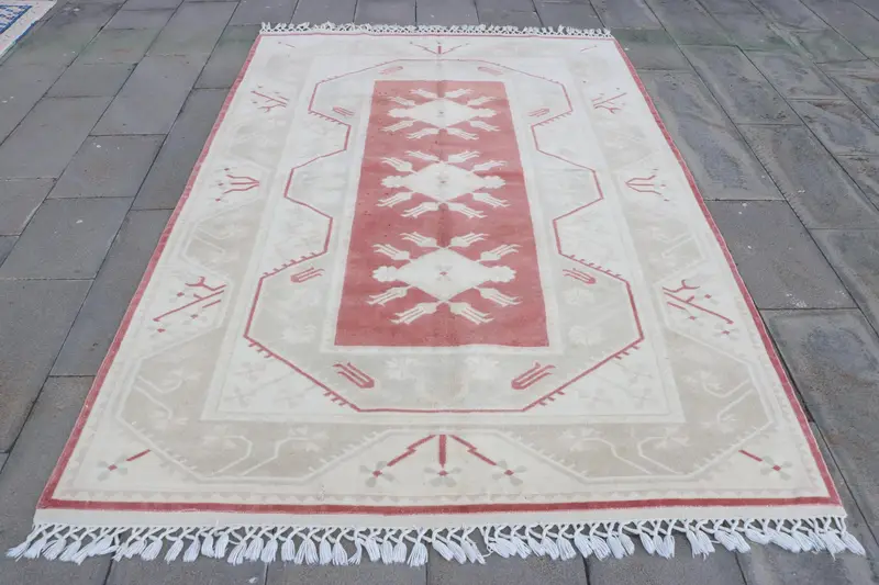 Zarif Bej Oryantal Halı, Kırmızı Desenli 5,5x8,2 ft