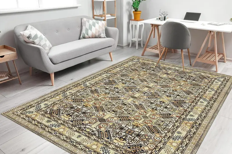 Geometrik Vintage Desenli Zarif Bej & Kahverengi Baskılı Halı