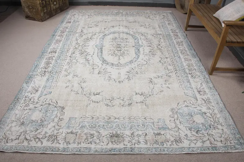 Zarif Bej ve Mavi Halı, 6,8x10 ft Puantiyeli Tasarım
