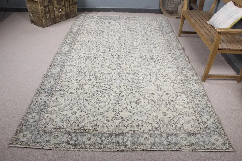 Zarif Bej ve Yeşil Kareli Halı, 5,8x9,7 ft