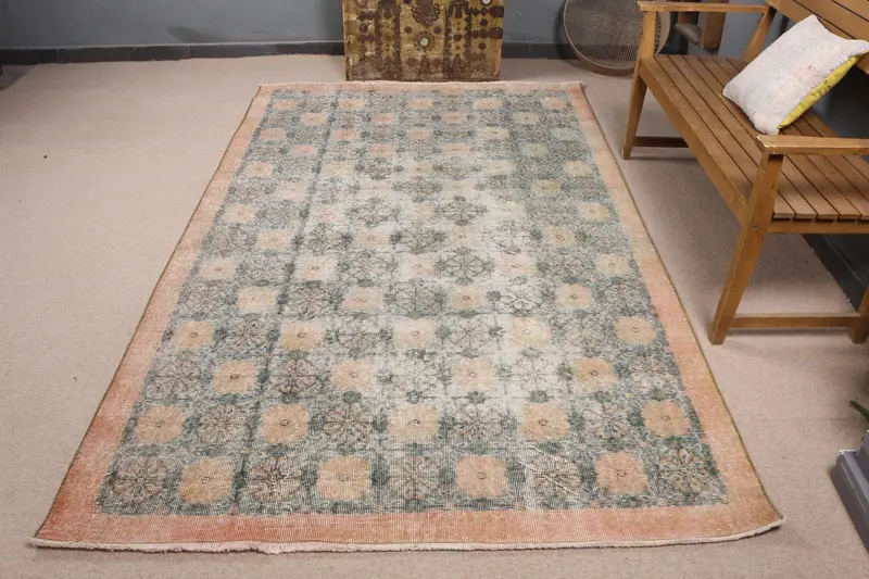 Zarif Yeşil Halı, Turuncu Desenli 5,4x8,8 ft