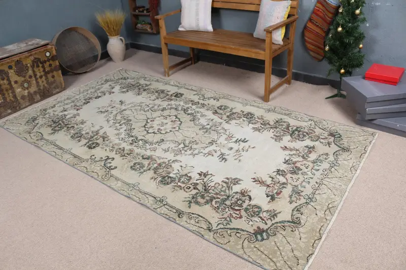 Yeşil Puantiyeli Zarif Bej Halı, 4,8x9,2 ft