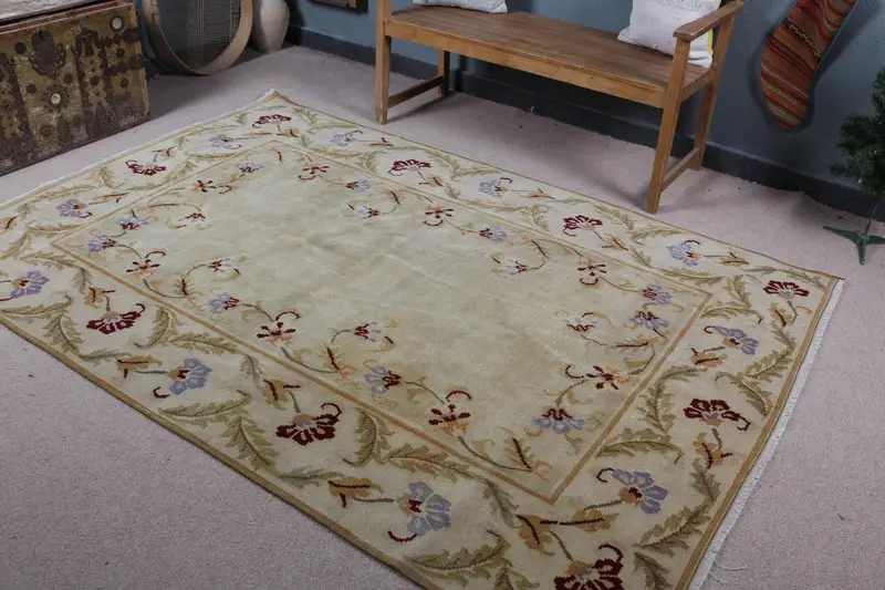 Zarif Yeşil ve Mor Halı, 5,4x7,9 ft Bordürlü Tasarım
