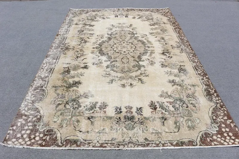 Zarif Bej ve Kahverengi Halı, 6,4x9,6 ft Bitki Desenli