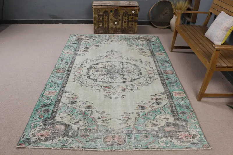 Zarif Bej ve Yeşil Halı, 5,2x8,1 ft Geometrik Çiçek