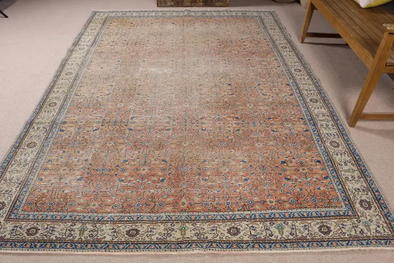 Canlı Turuncu ve Mavi Halı, 6,4x9,4 ft Botanik Tasarım