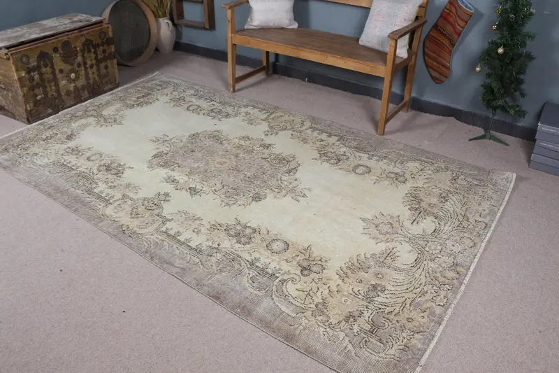 Zarif Bej ve Kahverengi Halı, 5,2x9,1 ft Botanik Tasarım