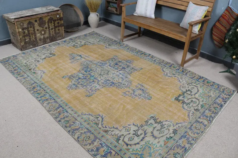 Turuncu ve Mavi Halı, 5,9x8,9 ft Geometrik Çiçek Desenli