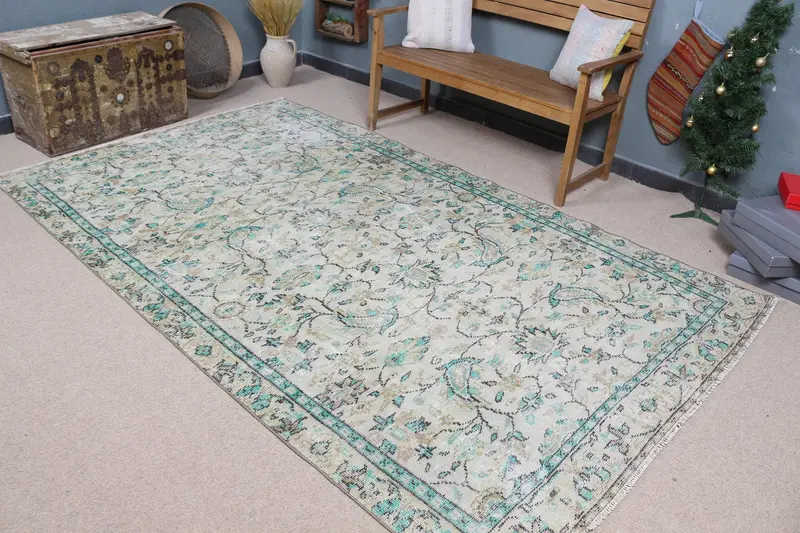 Zarif Bej ve Yeşil Halı, 5,6x9,4 ft Çizgili Geometrik Tasarım