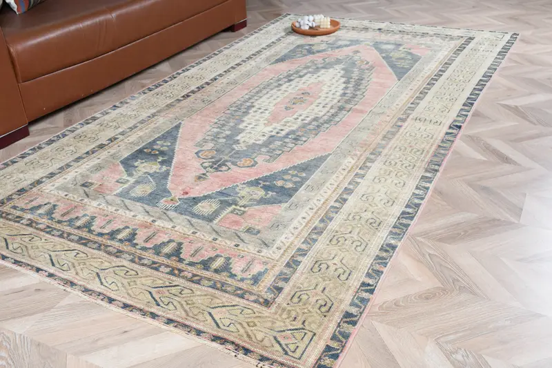 Kırmızı Fas Halısı, Mavi Desenli 4,9x9,5 ft