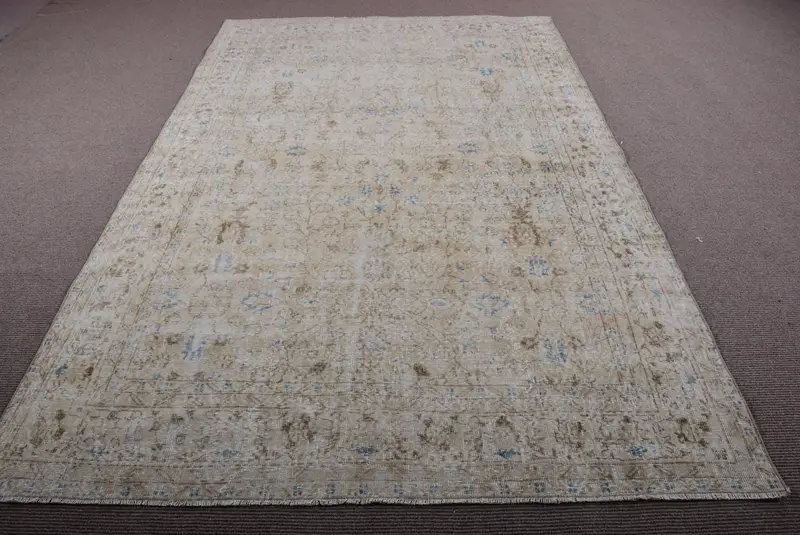 Mavi Bordürlü Zarif Bej Halı, 6,3x9,7 ft
