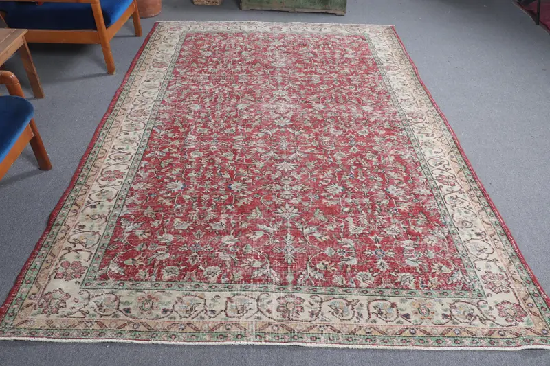 Kırmızı Çiçekli Halı, 6,3x9,3 ft Yeşil Paisley Vurgulu