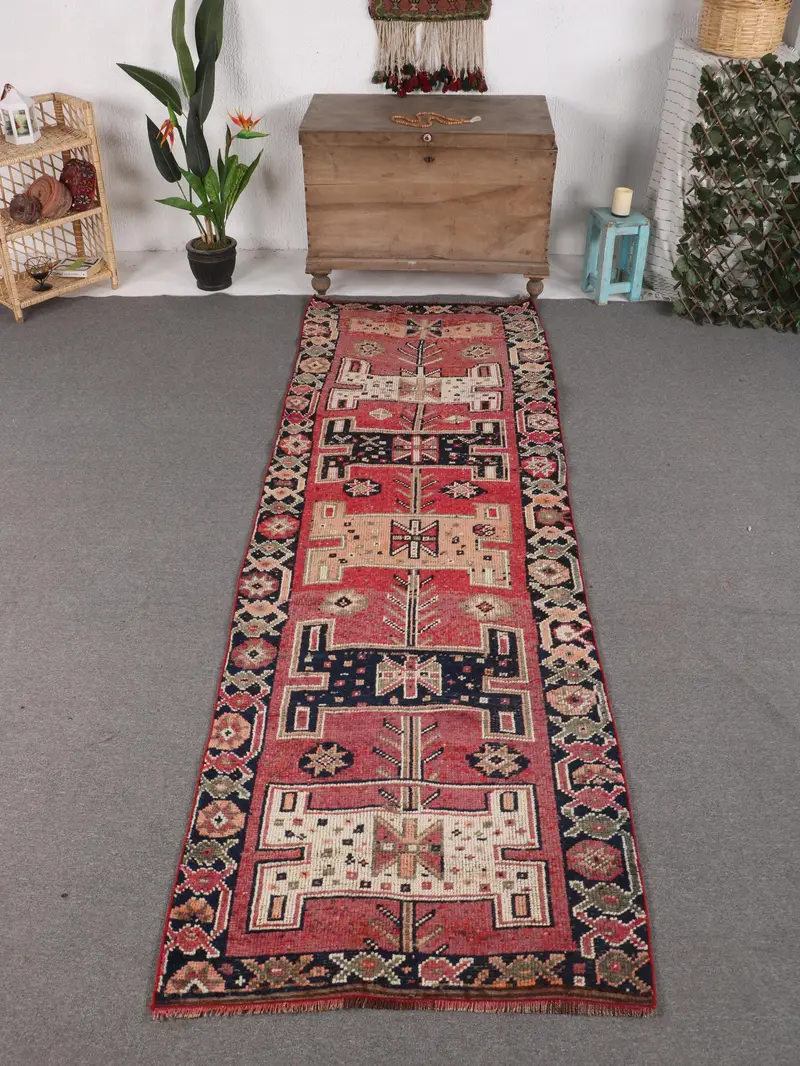 Pembe & Mavi Kareli Halı, 3,2x9,8 ft Şık Dekor