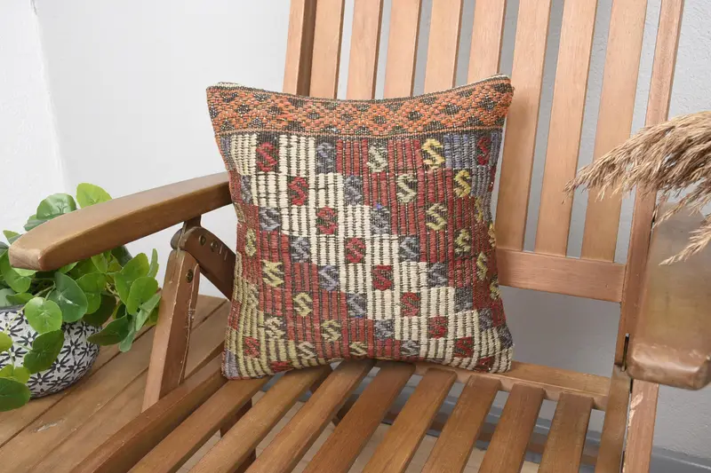 Kırmızı & Yeşil Geometrik Kırlent, Vintage İşlemeli Yastık