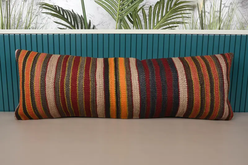 Kırmızı & Turuncu Çizgili Kırlent, Vintage İşlemeli Keten Yastık