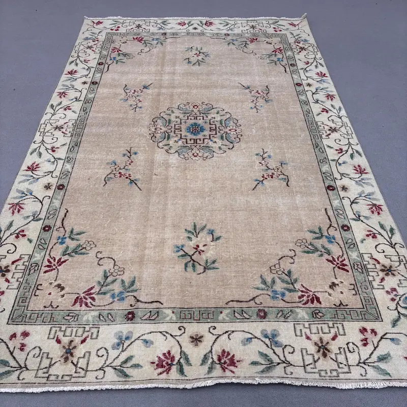 Zarif Bej ve Yeşil Halı, 6,2x9,8 ft Çiçek ve Geometrik