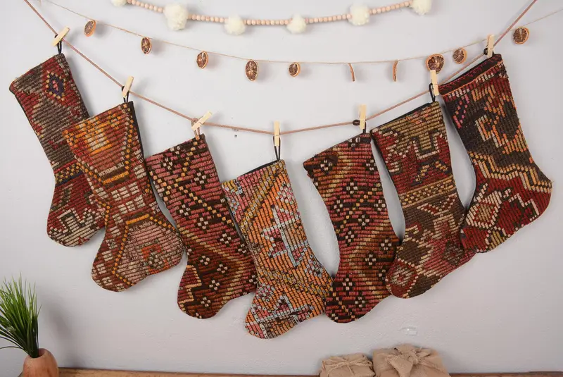 Kahverengi Süslü Kırmızı Noel Çorabı, Şenlikli Tatil Çorabı