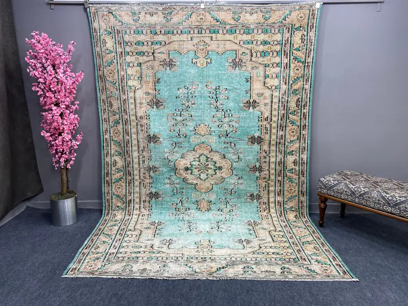 Mavi Geometrik Halı, Çiçek Motifli 6,5x9,9 ft
