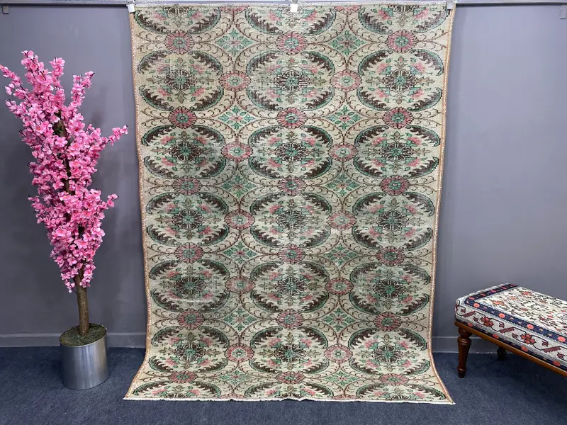 Zarif Yeşil Halı, Geometrik Çiçek Motifli 165x230 cm