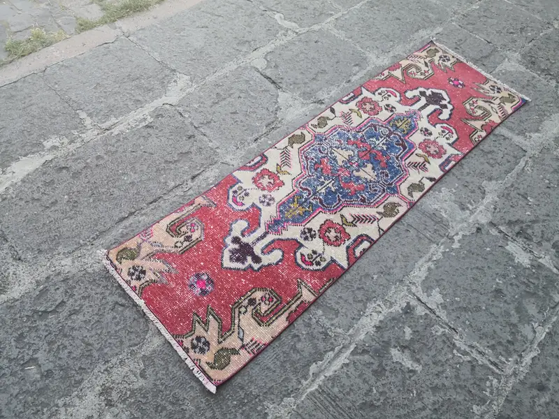 Kırmızı ve Mavi Oryantal Halı, 1,92x6,5 ft Zarif Dekor