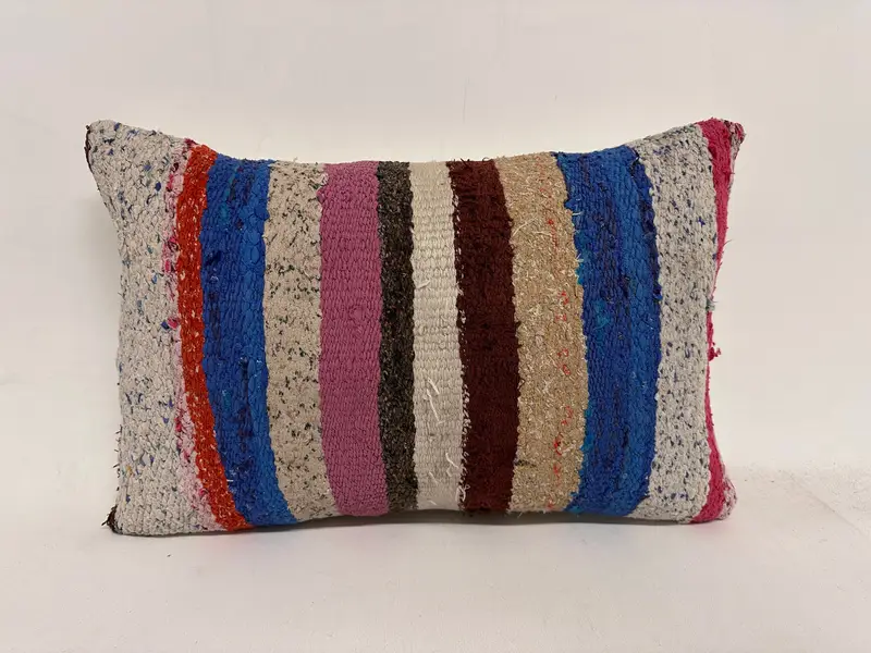 El Yapımı Mavi & Bej Çizgili Yastık, Nakışlı Dikdörtgen Kırlent