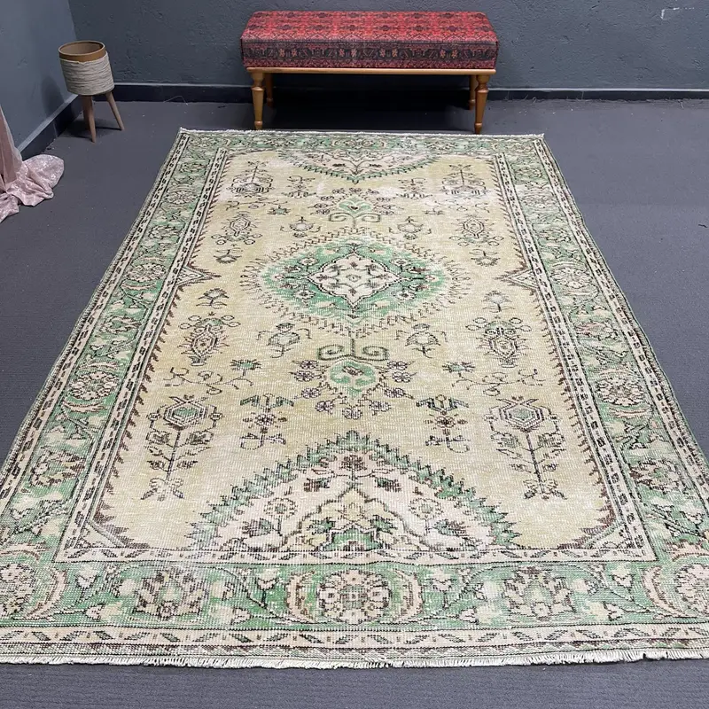 Sarı Soyut Halı, 6x9,1 ft Canlı Yeşil Vurgular
