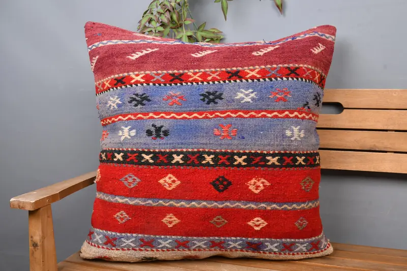 Mavi & Kırmızı Geometrik Kırlent, 28x28 Vintage Kırlent