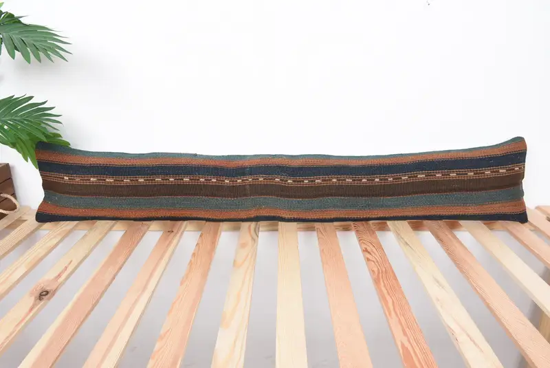 El Yapımı Yeşil & Kahverengi Çizgili Kırlent, 8x42 Keten Yastık