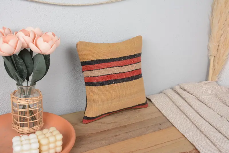 Bej & Kırmızı Çizgili Kırlent, Vintage İşlemeli Kırlent