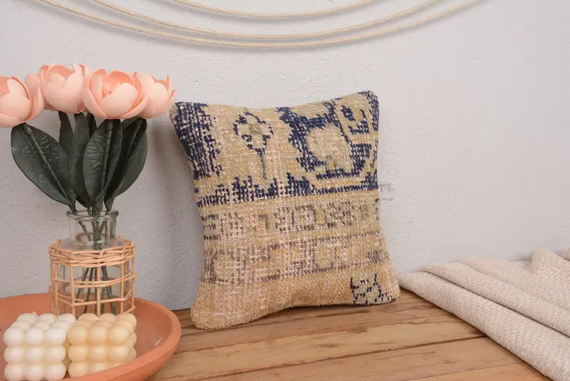 El Yapımı İşlemeli Mavi & Bej Çiçek Kırlent, Vintage Yastık