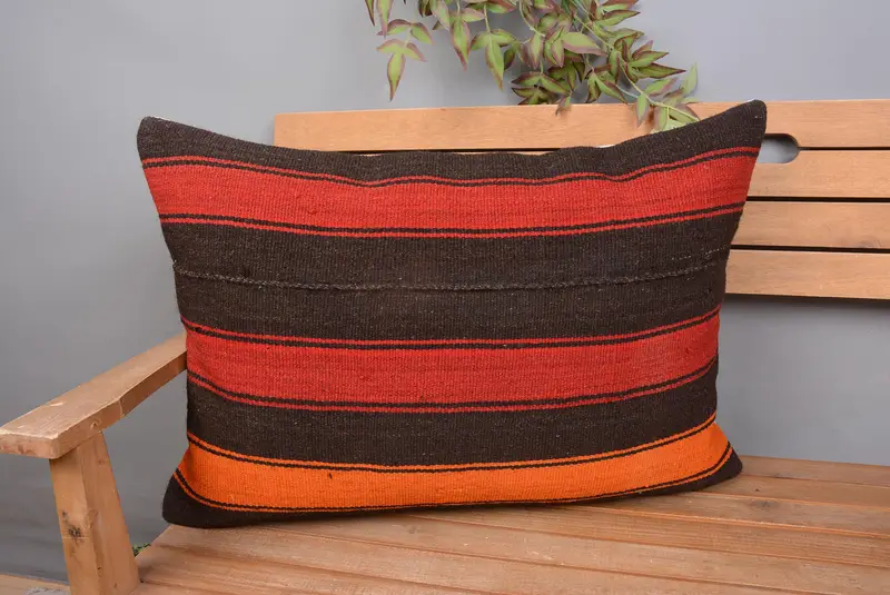 Kahverengi & Kırmızı Çizgili Kırlent, El Yapımı Nakışlı Dikdörtgen Yastık