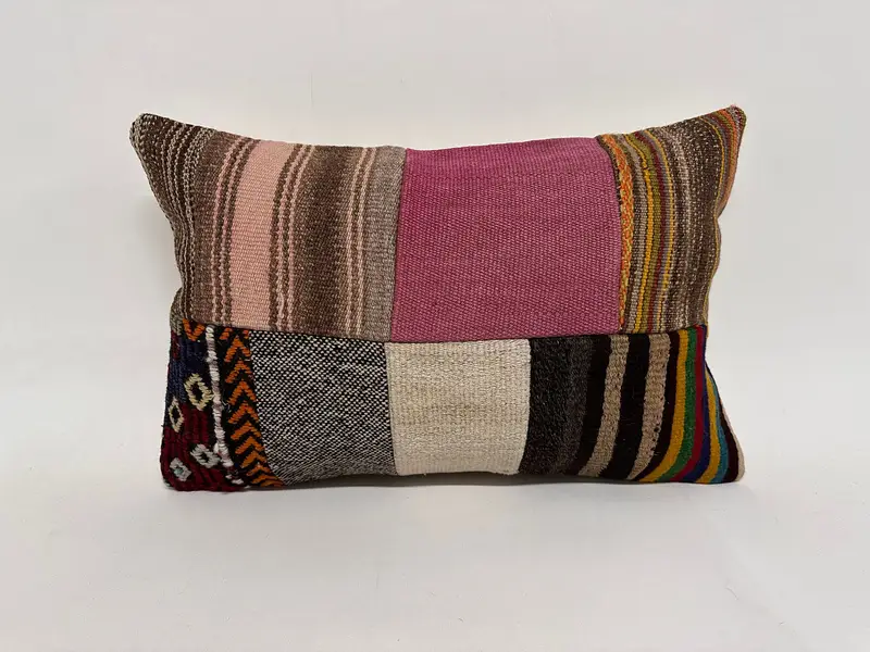 Nakışlı Bej & Kahverengi Patchwork Yastık, El Yapımı 16x24 Kırlent
