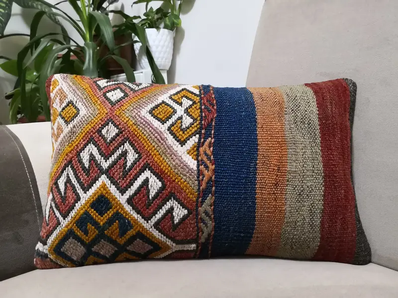 El Yapımı Çizgili Yün Kırlent, Dikdörtgen Kırmızı & Beyaz Vintage Yastık