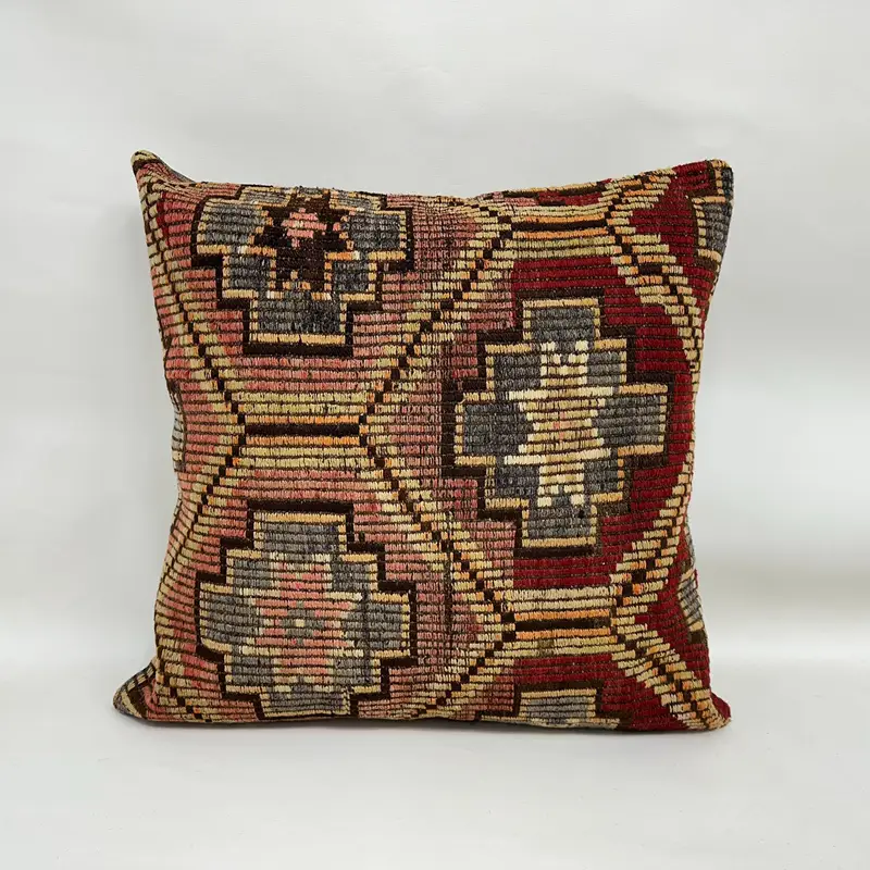 Bej ve Kırmızı Güneybatı Kırlent, İşlemeli Vintage Yastık