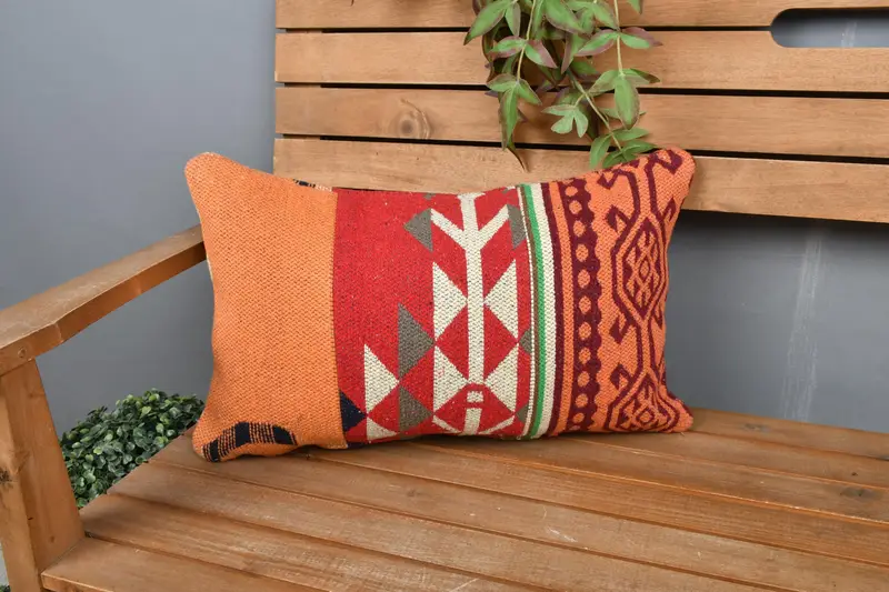 Kırmızı & Turuncu İşlemeli Kırlent, El Yapımı Geometrik Yastık