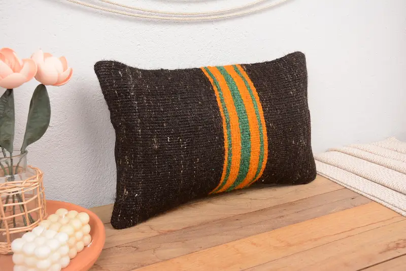 Kahverengi & Turuncu Çizgili Kırlent, El Yapımı Nakışlı Kırlent