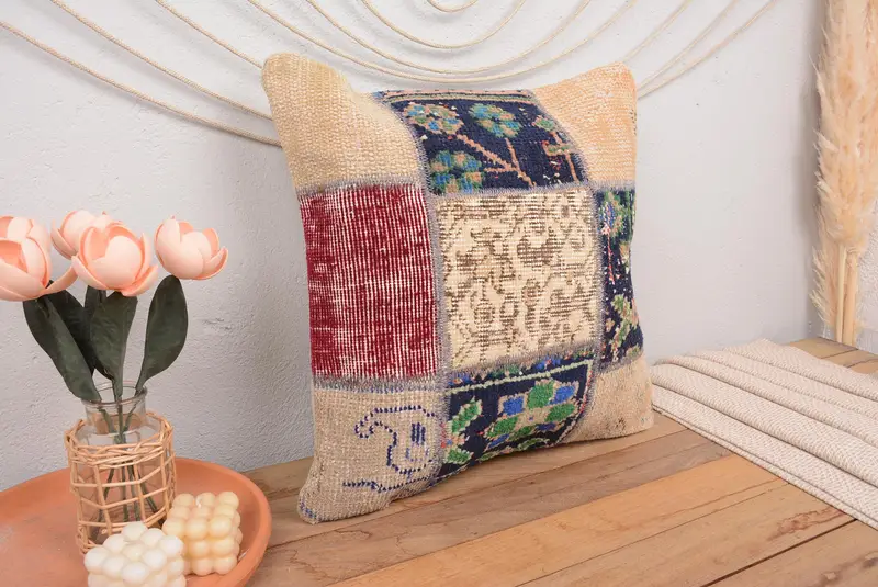 Bej ve Yeşil Patchwork Kırlent, Vintage İşlemeli Yastık