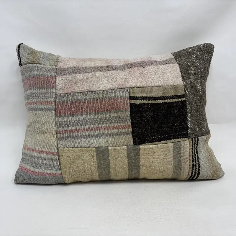 Bej & Gri Patchwork Kırlent, El Yapımı Nakışlı Kırlent